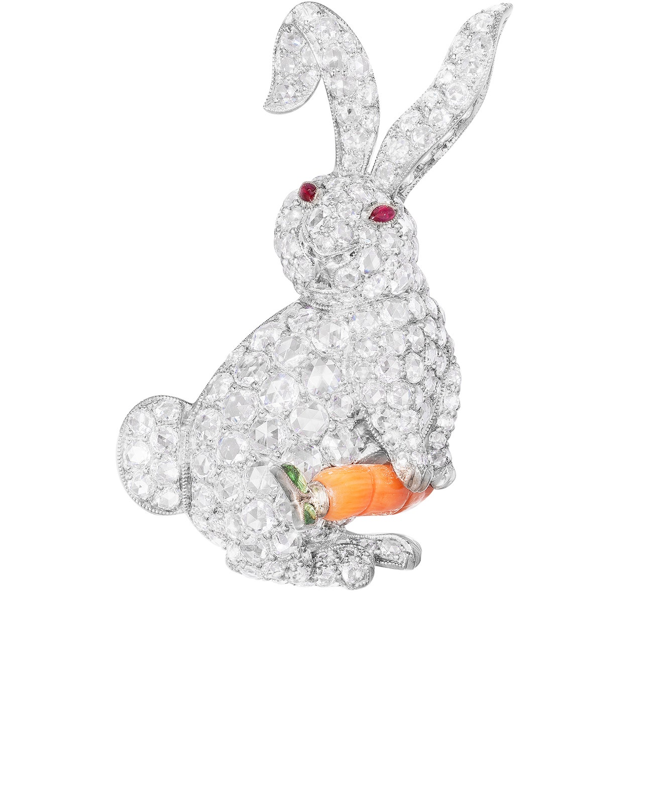 Designed as a rabbit, the body pavé-set with rose-cut diamonds, highlighted by a coral carrot with tsavourite garnet-set leaves and ruby-set eyes, mounted in white gold, signed Chavana, length approximately 40mm, case stamped Chavana.