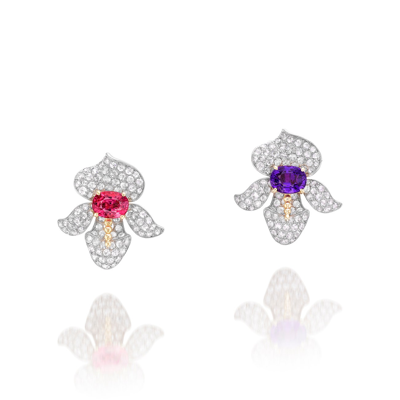 Of orchid design, each centring upon an oval coloured sapphire or an oval pink spinel weighing approximately 1.91 and 1.56 carats respectively, petals set with rose-cut diamonds, mounted in white and yellow gold, signed Chavana, numbered, post and hinged back fittings, length approximately 25 mm, case stamped Chavana.