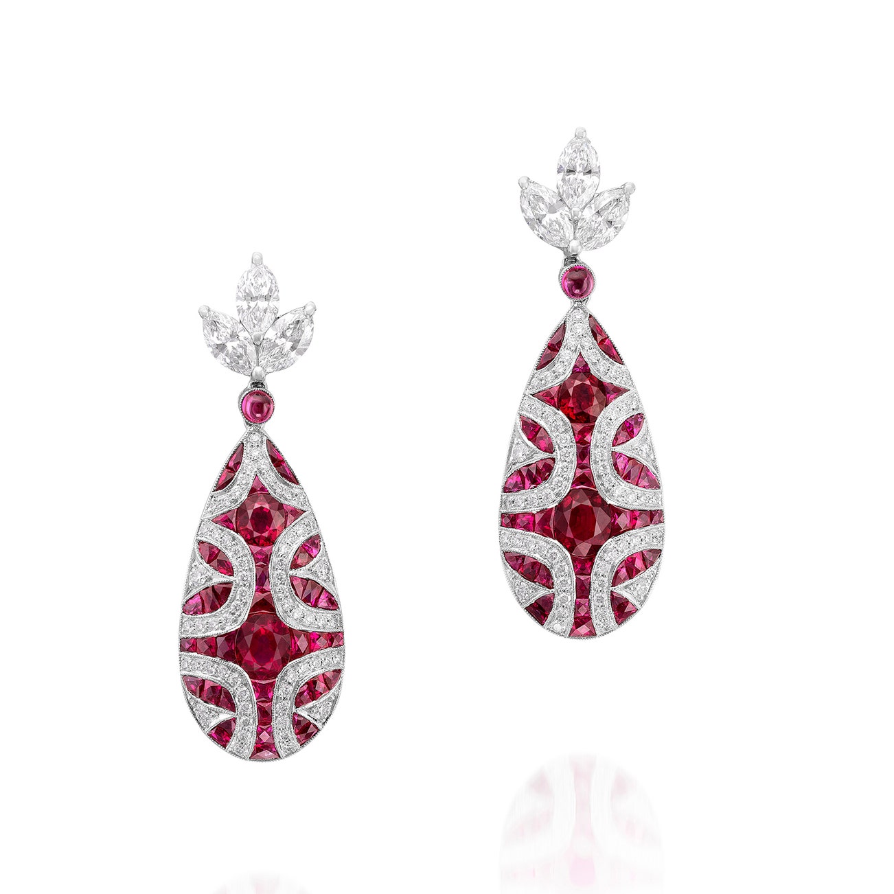 Each pendant designed as a drop, set with cushion-shaped, oval and calibré-cut rubies, decorated with brilliant-cut diamonds, spaced by cabochon ruby, suspending from marquise-shaped diamond top, mounted in platinum, signed Chavana, numbered, post and butterfly fittings, length approximately 36 mm, case stamped Chavana.