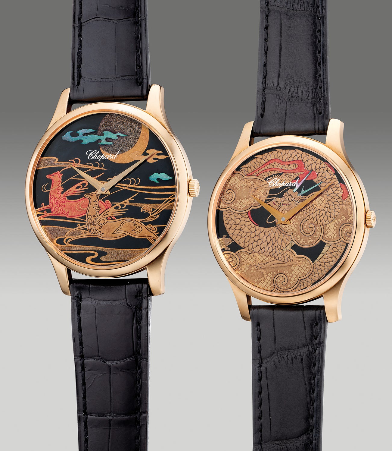 Each meticulously handcrafted and reveals a deep sense of poetry, these motifs are depicted through the use of three techniques, Urushi, Maki-e and Raden. The present set of examples illustrates two of the most elusive mythical creature in Asian culture. Under the gaze of the half moon, a pair of Kylin gracefully prance amongst iridescent clouds made with the “Raden” technique (mother-of-pear chips inlaid onto wet lacquer). Another features a fierce golden dragon with shimmering blue horns swivelling high amongst the enigmatic night sky. Blessed with the symbol of good fortune and tranquillity, the present pair in pink gold wristwatches offered in exceptional condition accompanied with individual octagon-shaped lacquer presentation box surely deserves the attention of the connoisseurs of extraordinary dials.