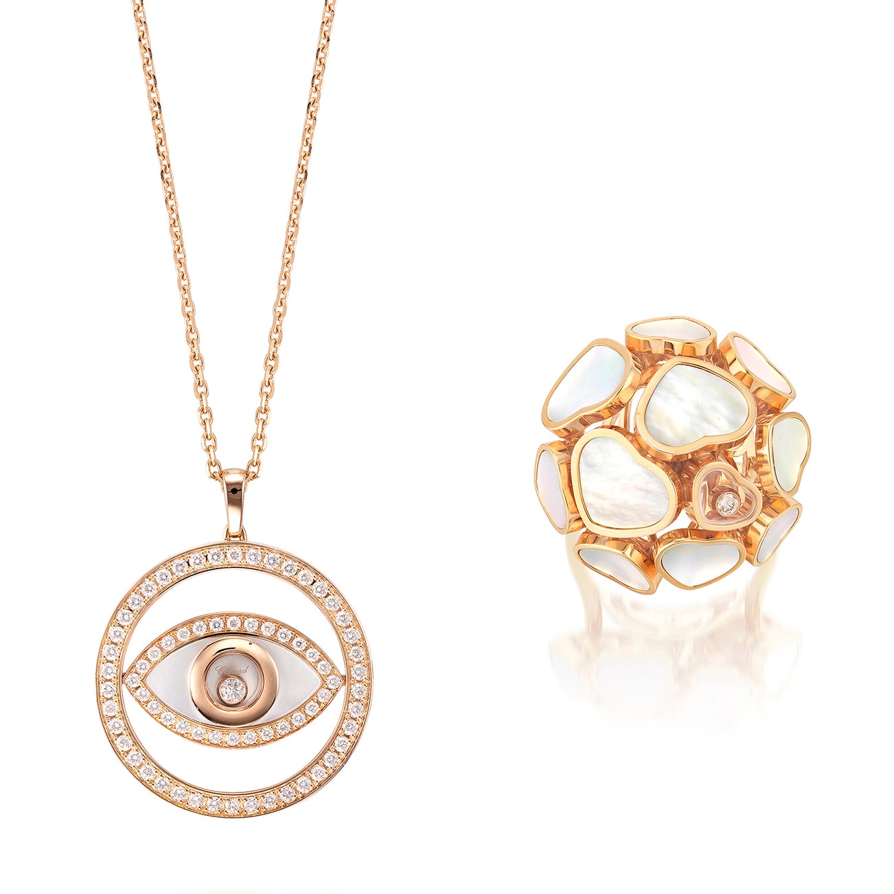 Mother-of-Pearl and Diamond Pendent Necklace and Ring, 'Happy Diamonds Evil Eye', and 'Happy Hearts'