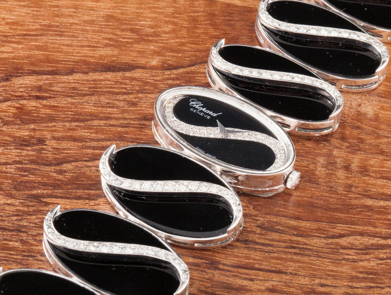 The watch case and links are oval-shaped white gold frames, set with polished onyx plaques, highlighted by a diamond set wave-shaped surmount. This geometric design displays incredible dynamism and is today, as it was at the time of its production, a most attractive work of art to be worn on special occasions.