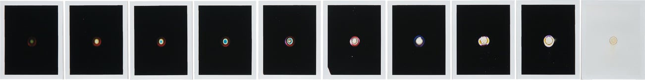 Since 2003, Chris McCaw has experimented with sun-burning photographic papers. Here, McCaw used a 40-inch lens to amplify the power of the sun and transform an entire pack of stacked Fuji diffusion film. With a single exposure McCaw created ten distinct impressions of the sun in which light exposed only the top layer of film, while the sun’s channeled heat transformed all ten layers to varying degrees.