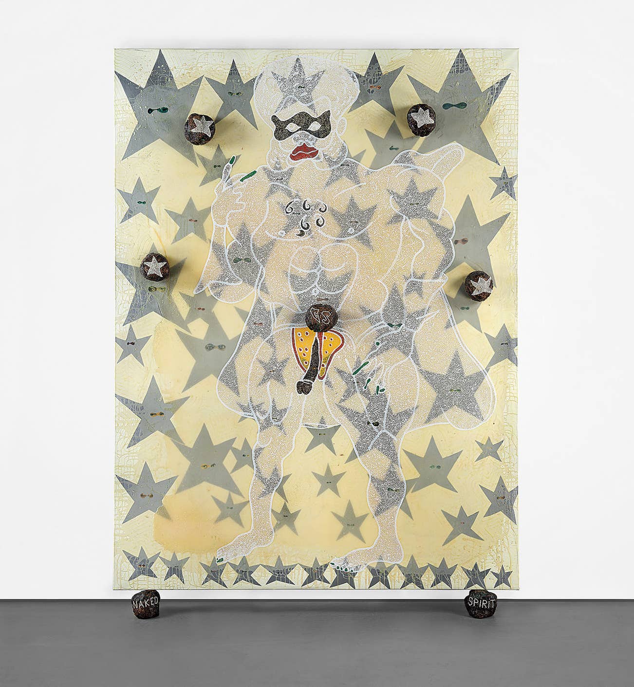 Executed in 2000-2001, The Naked Spirit of Captain Shit and the Legend of the Black Stars, is one of ten paintings belonging to the seminal Captain Shit series begun in 1996, from which others are held by Tate, London and the Carnegie Museum, Pittsburgh. Saturated in 1970s nostalgia, the present work features Ofili’s invented superhero Captain Shit rendered in a dazzling layer of glitter and resin atop a phosphorescent canvas smattered with gray stars, supported underneath by the artist’s signature elephant dung feet bearing the text “NAKED SPIRIT”. Created two years after Ofili became the first painter to win the Turner Prize since Howard Hodgkin in 1985, this visionary work is one of the last from the series, auguring Ofili’s appointment as the British representative at the Venice Biennale in 2003. The work was a highlight of the 2014 exhibition Night and Day at the New Museum, New York, Ofili’s first major exhibition in the U.S. since his inclusion in the controversial Sensation exhibition at the Brooklyn Museum in 1997.