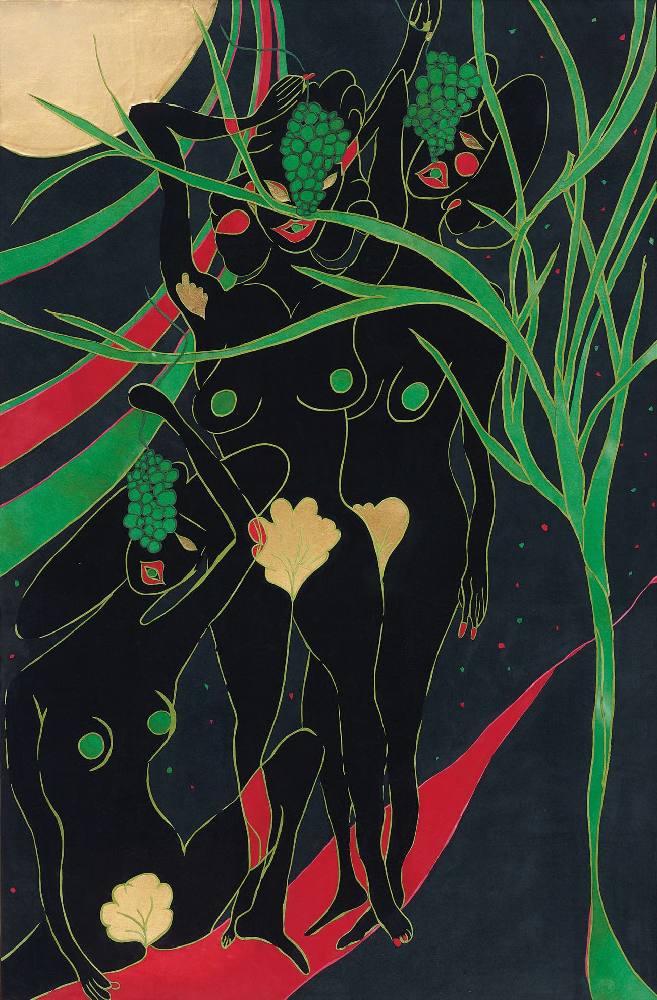 Large and imposing, Pramnian Odyssey 2, dominates the space of the viewer, confronting us with the very paradigms that seek to confront the most dogmatic preconceptions of black culture, or the construction of ‘blackness’. Whilst comprising of more simplified forms than in his previous works, the black nude female figures are nonetheless just as dramatic, expansive and romantic, standing as clear references to sensuality and sexuality. Ofili places an astute emphasis on the beauty of the female body, attempting to describe it with an exploration of line, form and shape– a focus which recalls that seen in Gauguin’s Polynesian paintings, and Picasso in his depiction of five female nudes in his 1907 painting, Les Demoiselles d’Avignon. Ofili, however, places particular prominence on the significance of a black subject: an aspect which speaks to the artist’s endeavour “to make paintings that would look like they were black paintings– ‘Afro’ paintings” (ibid, p. 248). Looking at the way the (black) female form has been dealt with in the past, the artist essentially works to insert something into a historic lineage of imagery, hinging on several historical and conceptual issues, such as rendering visible that which is invisible, and the seeking of social redress. In this way, the present lot– vibrant, technically complex, and meticulously executed– is testament to the legacies of Jean-Michel Basquiat and David Hammons, deftly playing with the idea of the black aesthetic.