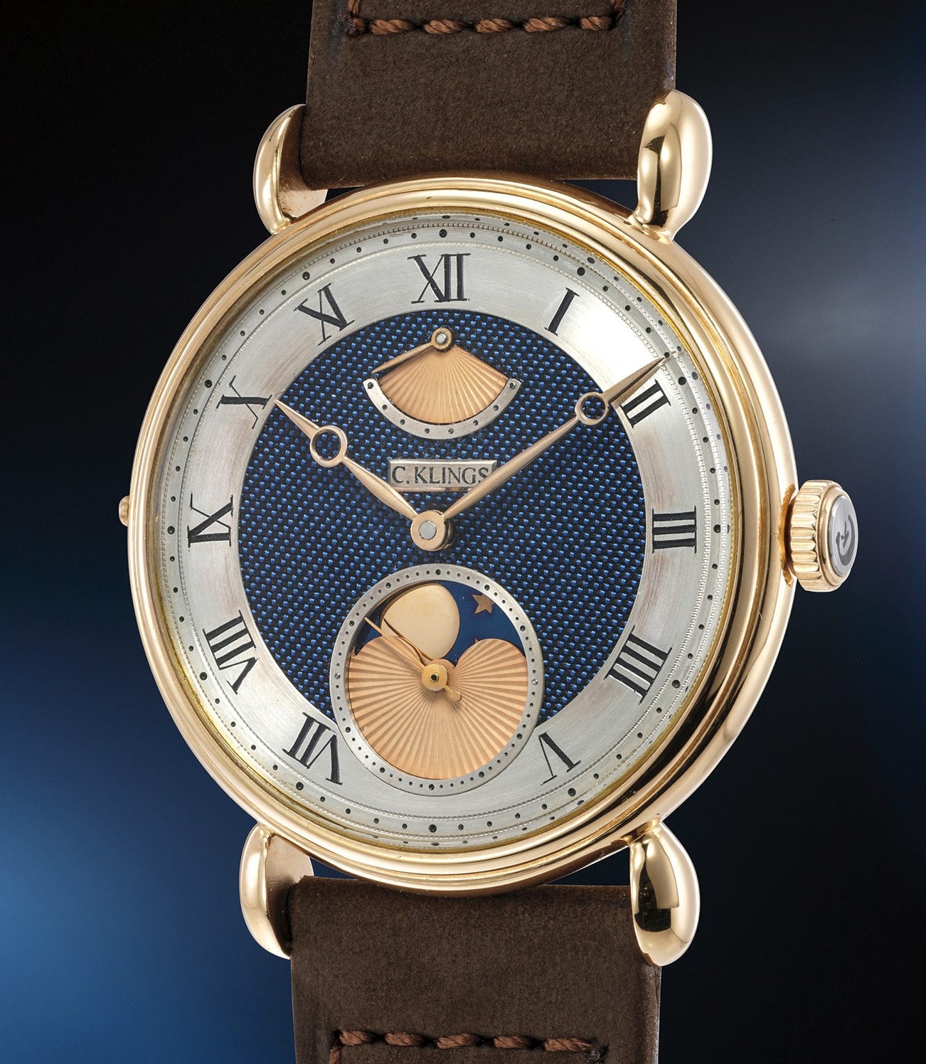 Even though Klings is a traditionalist he is open to new techniques, such as what he has done with the dial (which he also handmakes) whereas the sections around the power reserve and moonphase have a vertical guilloché pattern, the central blue area of the dial is made of silk which has been conglomerated into the dial giving it such a particular color and texture.