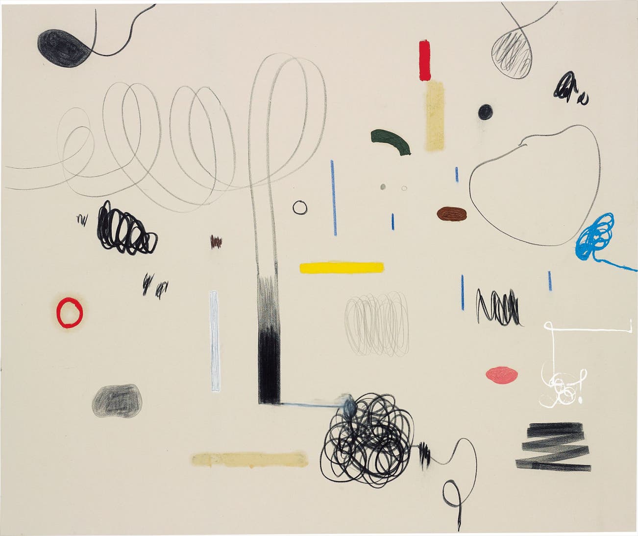 The current work, Run Run Hide Hide, 2014, presents isolated elements and shapes of primary color floating against a raw canvas background. Although minimal in appearance, the various markings on the canvas, such as lines, squares, spots and scribbles still suggest the beginning of some kind of figuration. In the present lot, wisps of yellow, dollops of blue, and streaks of white dance across the picture plane with whimsy and spontaneity, leaving merely a trace of their game of hide and seek. They also become the elements for further engagement and meditation. Rosa uses the textural qualities of the diverse materials to encourage emotional responses in the viewer. By creating numerous planes of energy on the canvas, he develops different narratives with endless possibilities – each deeply personal to the viewer.
