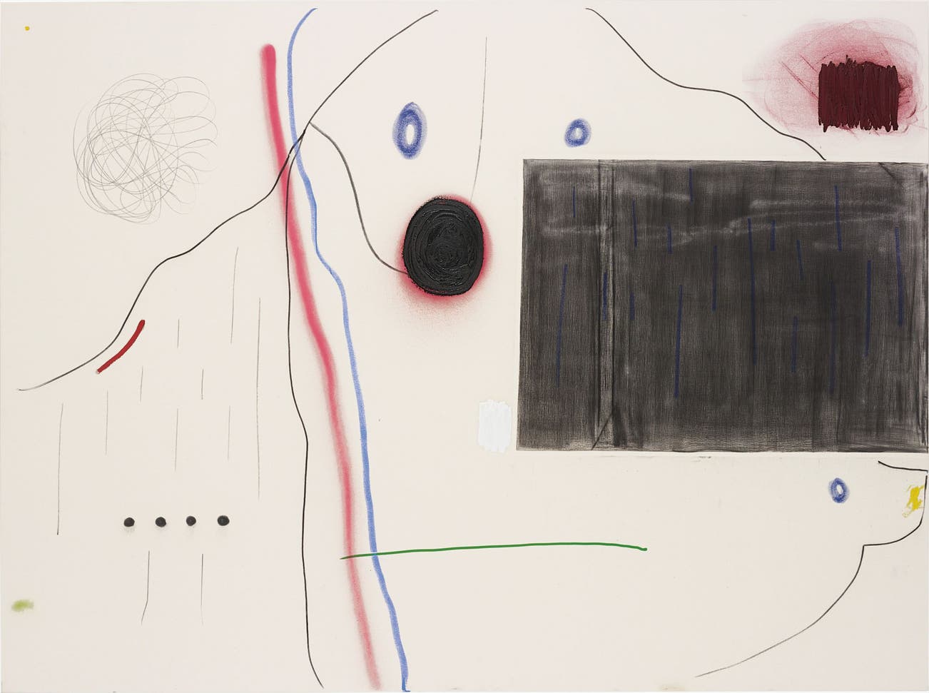 pencil, charcoal, spray paint, oil stick, oil on canvas
