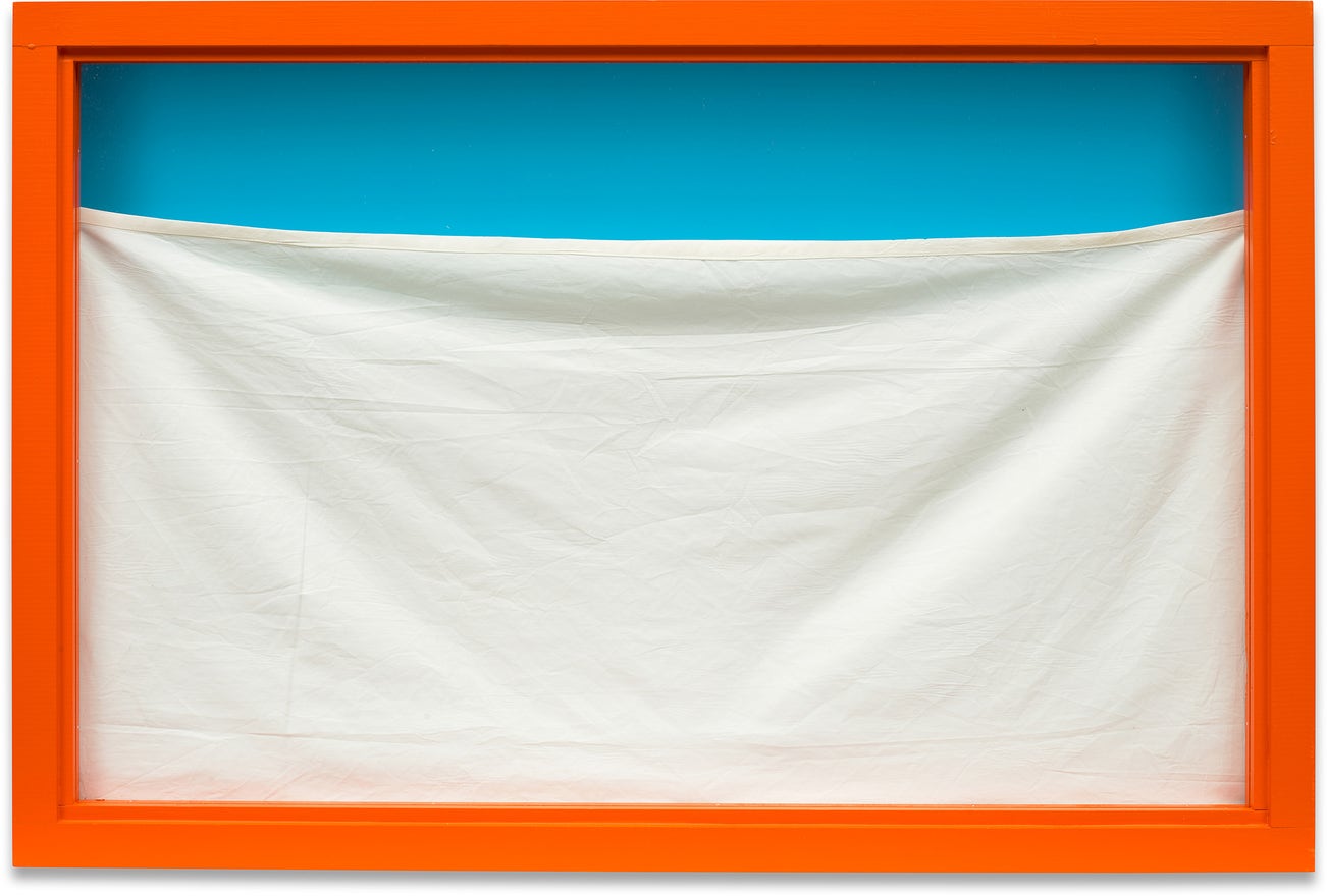 Wooden frame painted with enamel in colours with fabric under Plexiglas.