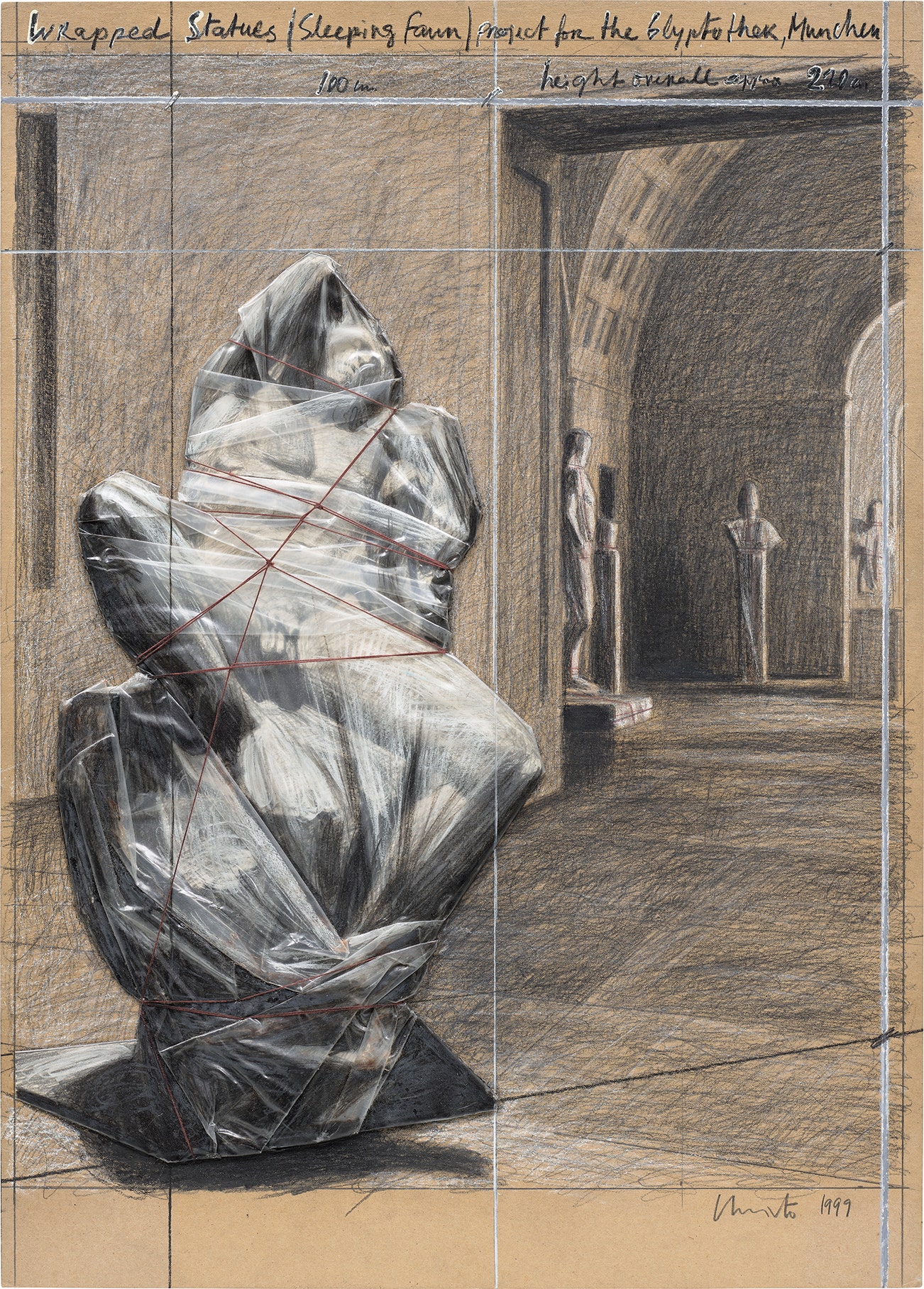 signed and dated 'Christo 1999' lower right; titled 'Wrapped Statues, Sleeping Fawn, Project for the Glyptothek, Munich' upper edge