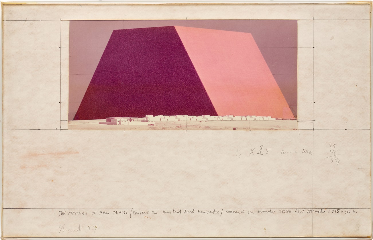 signed, titled and dated 'THE MASTABA OF ABU DHABI PROJECT FOR UNITED ARAB EMIRATES Christo 1979' lower left; inscribed and dated 'CHRISTO 1979' on the reverse