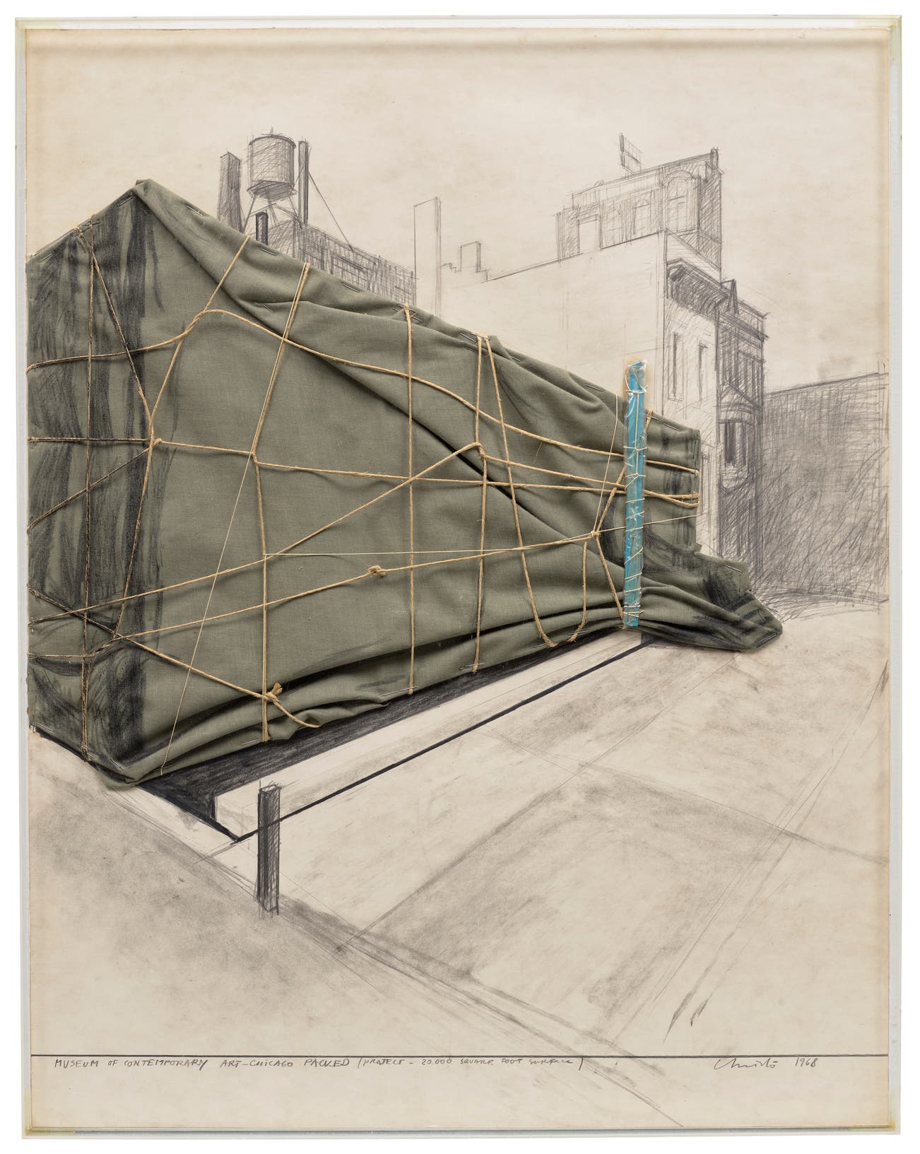 graphite, charcoal, fabric, twine, rope, polyethylene, staples and wax crayon on card laid down on board, in Plexiglas box