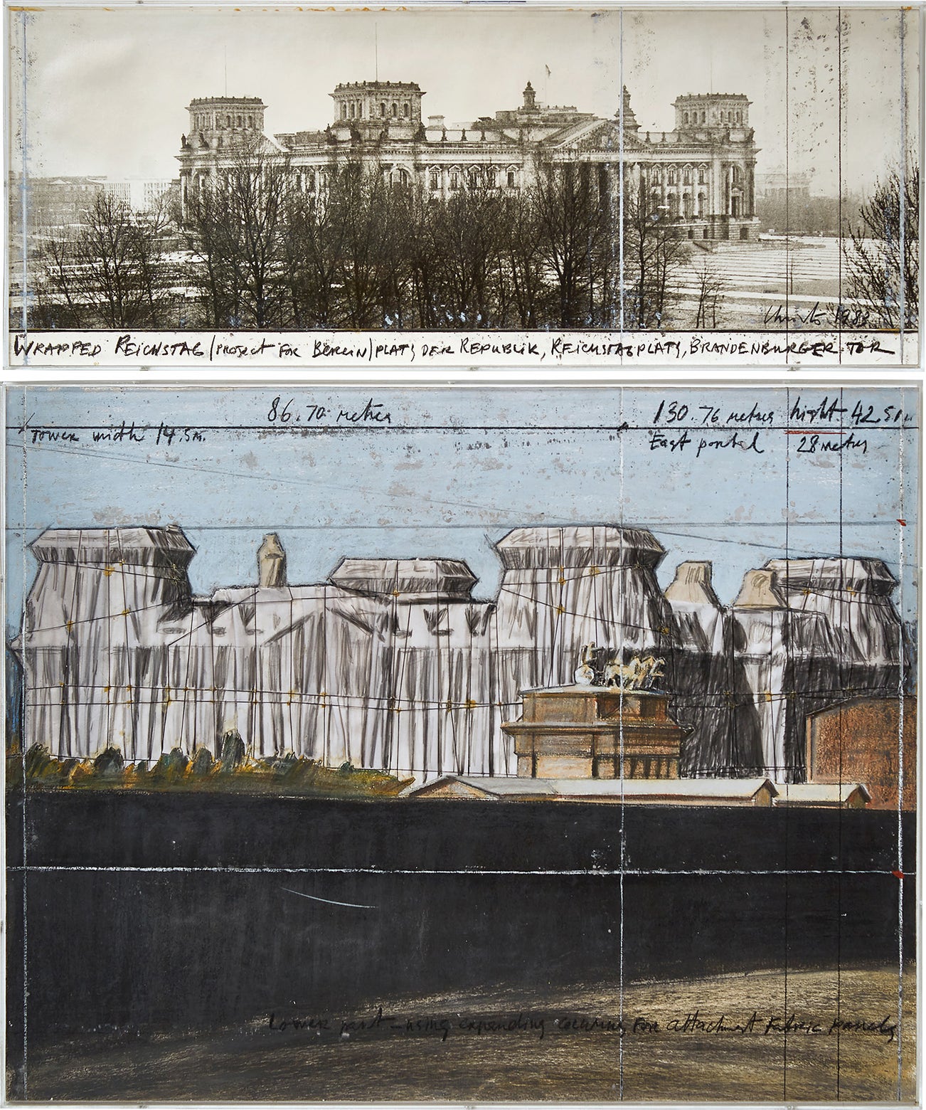signed, titled, inscribed and dated "Christo 1983 WRAPPED REICHSTAG (PROJECT FOR BERLIN) PLATZ DER REPUBIK, REICHSTAG PLATZ, BRANDENBURGER TOR" lower edge of upper element