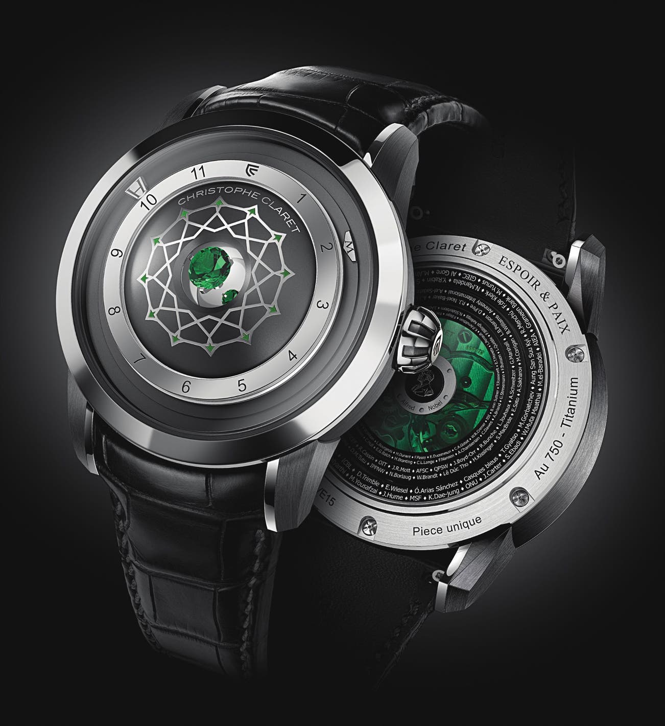 With the Espoir & Paix model, Christophe Claret pays tribute to Hope in the dial center with a green emerald highlighted by a mirascope; and to Peace with the case-back dedicated to the 129 Nobel Peace Prize laureates.
