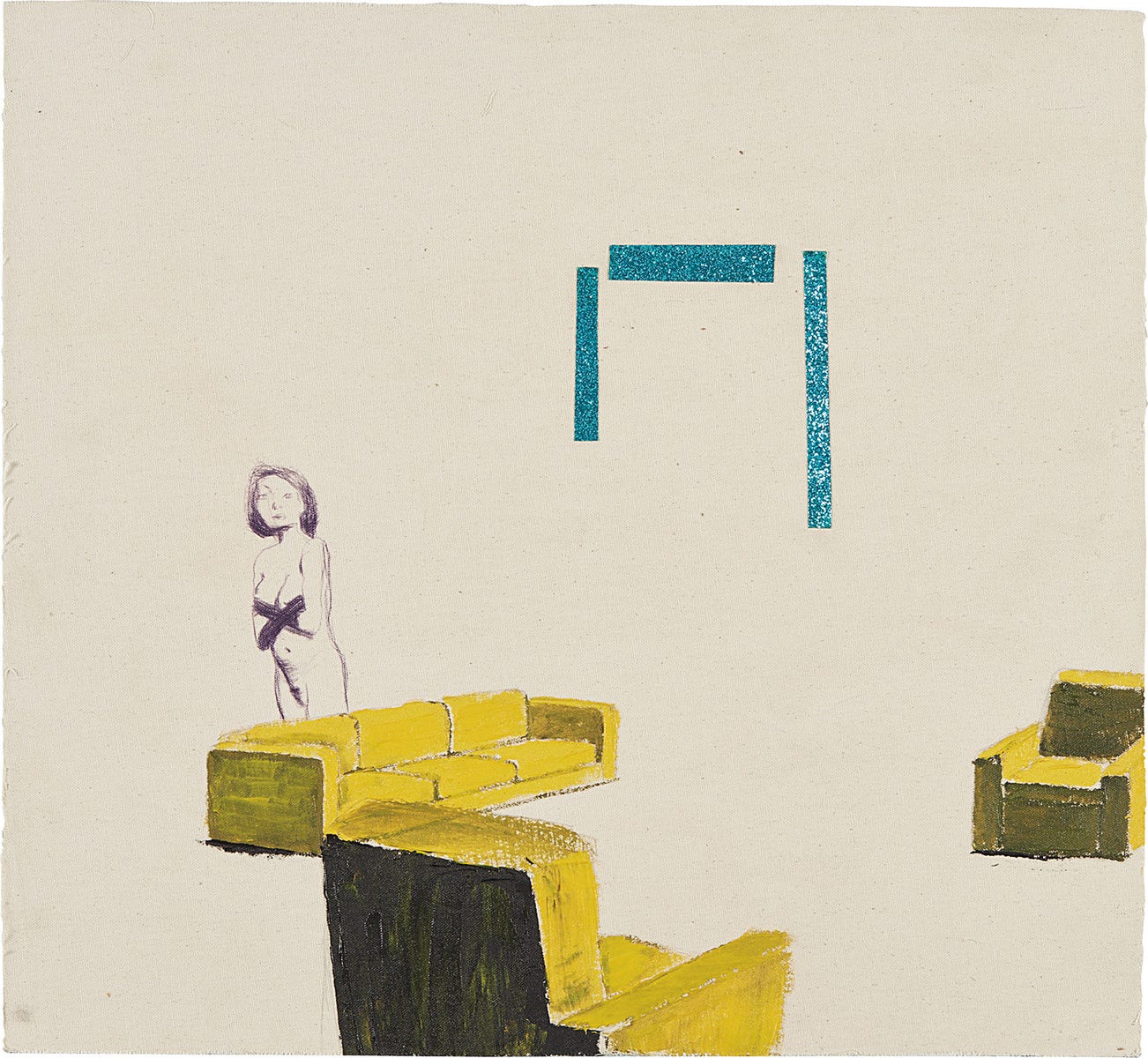oil, glitter tape and ballpoint pen on canvas, mounted on board