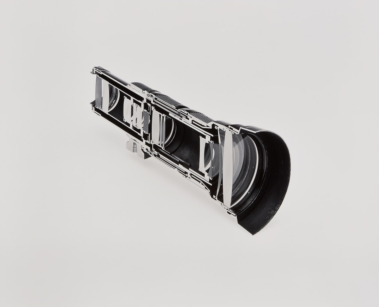 Cutaway model Nikkor zoom lens 50-300mm f/4.5. Focal length: 5-300mm. Maximum aperture: 1:4:5. Lens construction: 20 elements in 13 groups. Picture angle: 46°(f=50mm) - 8° 10'(f=300mm.) Distance scale: Graduated in meters or feet up to 2.5m (8.5 ft.) to infinity. Aperture scale: f/4.5-f/22. Aperture diaphragm: Fully automatic. Meter coupling prong: Integrated (fully open exposure metering.) Focusing: By turning the focusing ring. Zooming: By turning the zooming ring (reference markings for 50, 60, 70, 85, 105, 13, 200, 250 NS 300mm.) Attachment size: 95mm (P=1.00.) Filter: 95mm screw-in. Fabricated by Andre Benschop, Veldhoven, The Netherlands. Photography by Douglas M. Parker Studio, Glendale, California, October 13, 2007 - October 29, 2007