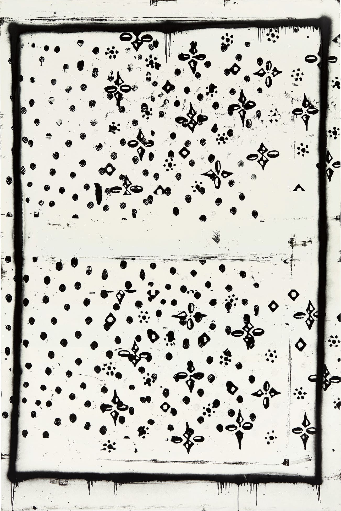 Untitled (P271) communicates a story whereby the process of improvisation, imperfection and distortion culminate to create an evocation of a celestial sky, inversely represented with black on white as opposed to white on black. The dripping frame, barely containing the image, is a doorway to another world, inviting the viewer to step in and discover a lesser ventured realm.
