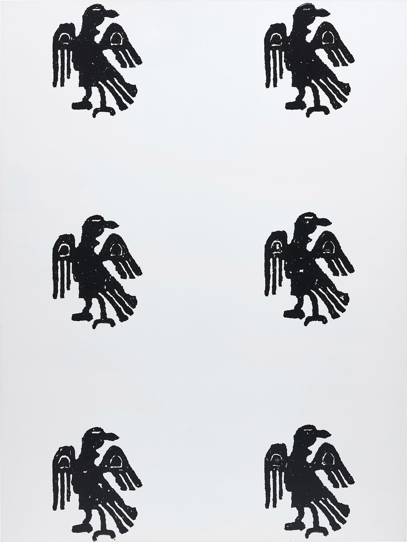 Oscillating between the abstract and the figurative, the majestic black eagles of Christopher Wool’s 1989 Untitled appear suspended in mid-air against a white smooth aluminium surface. The monochrome black eagle, one of the artist’s most instantly recognisable motifs, is an exemplary design of the artist’s pivotal rubber stamp series. The repetitious nature of the composition pushes the boundaries of image production and reproduction in contemporary art, stressing the artist’s intellectual engagement with conceptual artistic discourse.