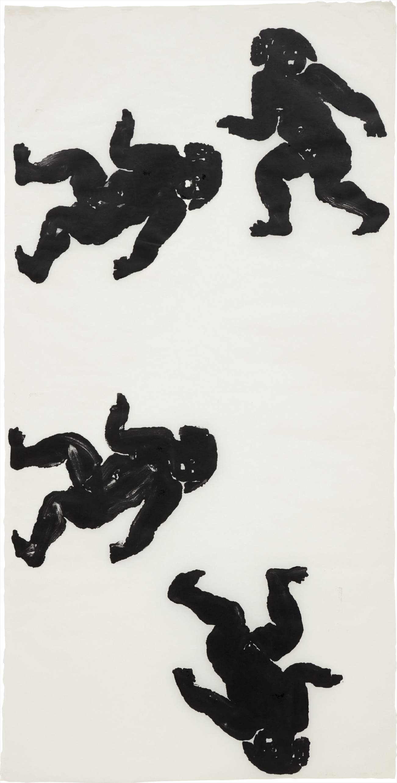 Throughout Christopher Wool’s oeuvre, the artist utilizes a handful of technical devices to explore numerous visual tensions within his practice. Predominantly in black and white, the stark contrast of his monochrome palette is the first and most obvious juxtaposition found throughout his enamel paintings on canvas and paper. In the present lot from 1990, Wool has applied the dark black enamel paint with a patterned stencil onto thin rice paper, creating an additional contrast between the heaviness of the four figures and the sheer paper ground on which they rest. The composition exhibits a further opposition in the mechanical process of stenciling he employs combined with the evidence of his own hand, apparent in the slight imperfections of the paint’s application. Vertically oriented, the four figures are illustrated walking across the surface in different, horizontal directions, thus presenting yet another visual tension in the orientation of the composition. The repeated silhouetted figure calls to mind the artist’s earlier Pattern paintings of the 1970s, which first blurred the lines between fine art and decoration. Unlike these early, spotted Pattern paintings, which seem to recall the drip application of Abstract Expressionist masters like Jackson Pollock, the present lot’s pattern seems to instead harken back to a prehistoric cave painting. As the figures march across the narrow composition of the rice paper, Wool’s pattern reverses these cave paintings from a dark background with light, carved shapes to a light background with a darker shape, thus linking his own characteristic and contemporary style to the historic beginnings of art.