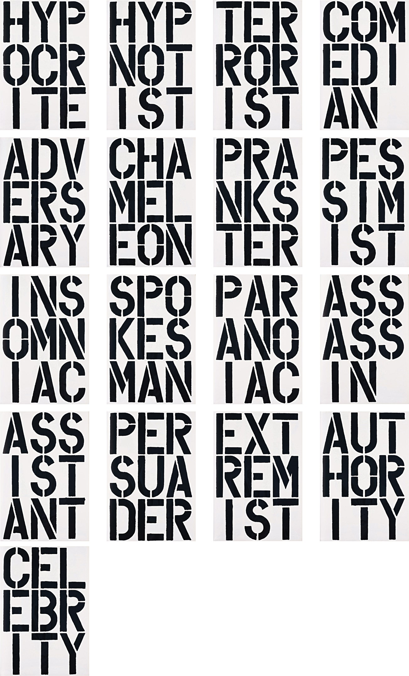 Including: Hypocrite; Hypnotist; Terrorist; Comedian; Adversary; Chameleon; Prankster; Pessimist; Insomniac; Spokesman; Paranoiac; Assassin; Assistant; Persuader; Extremist; Authority; and Celebrity.