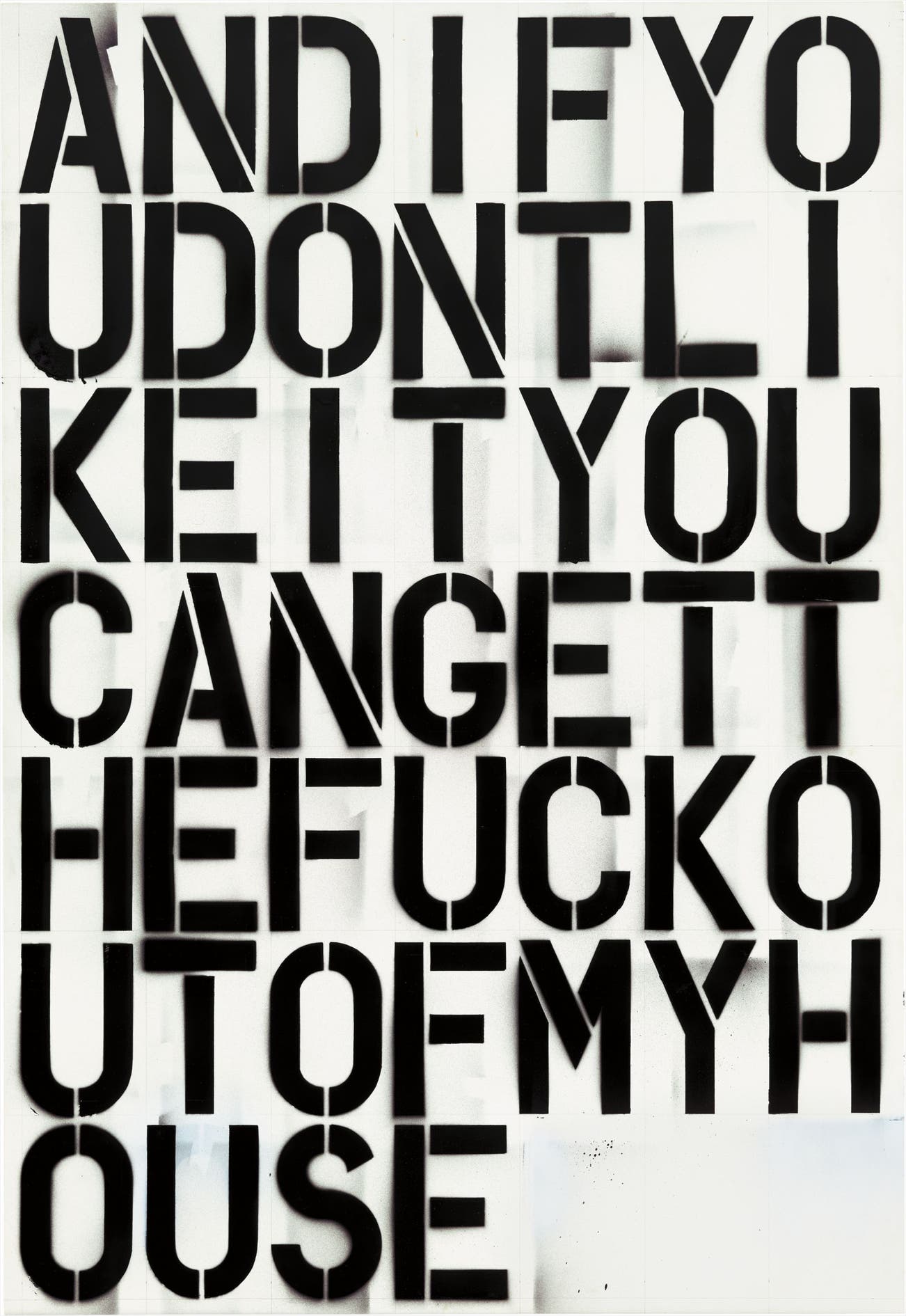 The oversize letters of And If, 1992 leap of the white canvas, uncompromising in their bid for the viewer’s attention. While the message is clearly explicit, the overall meaning remains somewhat ambiguous. The participants in this graphic dialogue are anonymous to the viewer, and so the abruptly harsh comment becomes just another frank exchange lifted from the infinitely similar dialogues of everyday New York City. This type of blunt message is similarly featured in other Word paintings by Wool, with such statements as “Fuck em if they can’t take a joke” (FUCKEM, 1992) or “If you can’t take a joke you can get the fuck out of my house” (If You, 1992). Wool’s use of lettering and his purposeful exclusion of spacing creates a daunting atmosphere for the phrase presented. Nearly bursting out of their frame, the letters of Wool’s profanity highlight the air-tight parameters of the canvas, giving the words a sense of emergence from the background, assaulting the viewer with their insistent declaration. This sense of threat is bolstered by the typeface; similar to the stenciled font assumed by the United States military after the Second World War, Wool’s