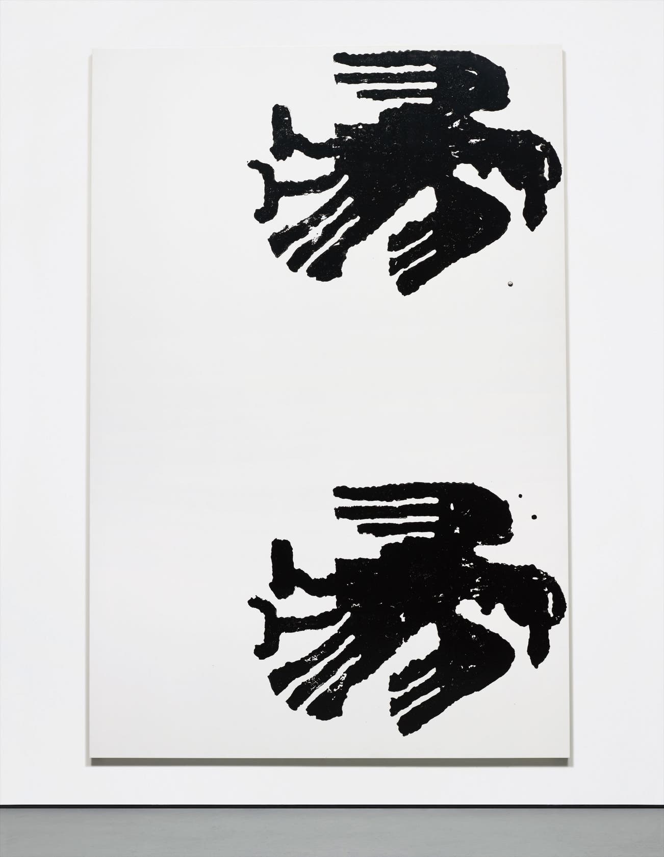 Untitled, a large format alkyd and acrylic on aluminium, navigates seamlessly between the abstract and the figurative. The composition consists of two large scale avian forms; both sit against a pure white aluminium ground. On first glace each symbol looks indistinguishable but on closer inspection minor nuances in paint application and surface imperfections become increasingly visible, providing an insight into Wool’s newly developed method. The large scale of Untitled permeates rawness and life to both birds, each confined within the limitations of the aluminium sheet, they give the impression that at any opportune moment they might come to life and escape the picture plane.