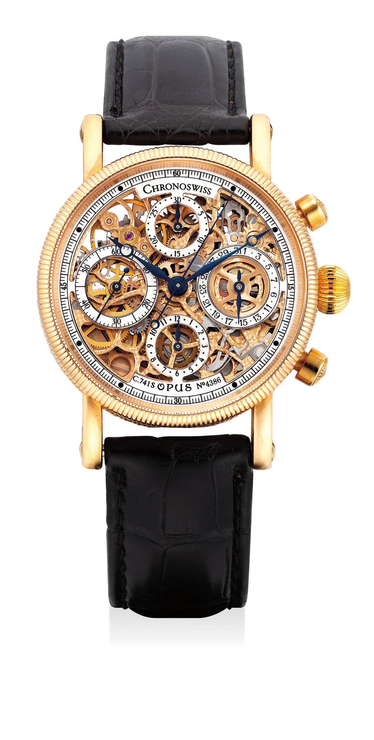 A fine, attractive and unusual pink gold skeletonized chronograph wristwatch with date and hack feature