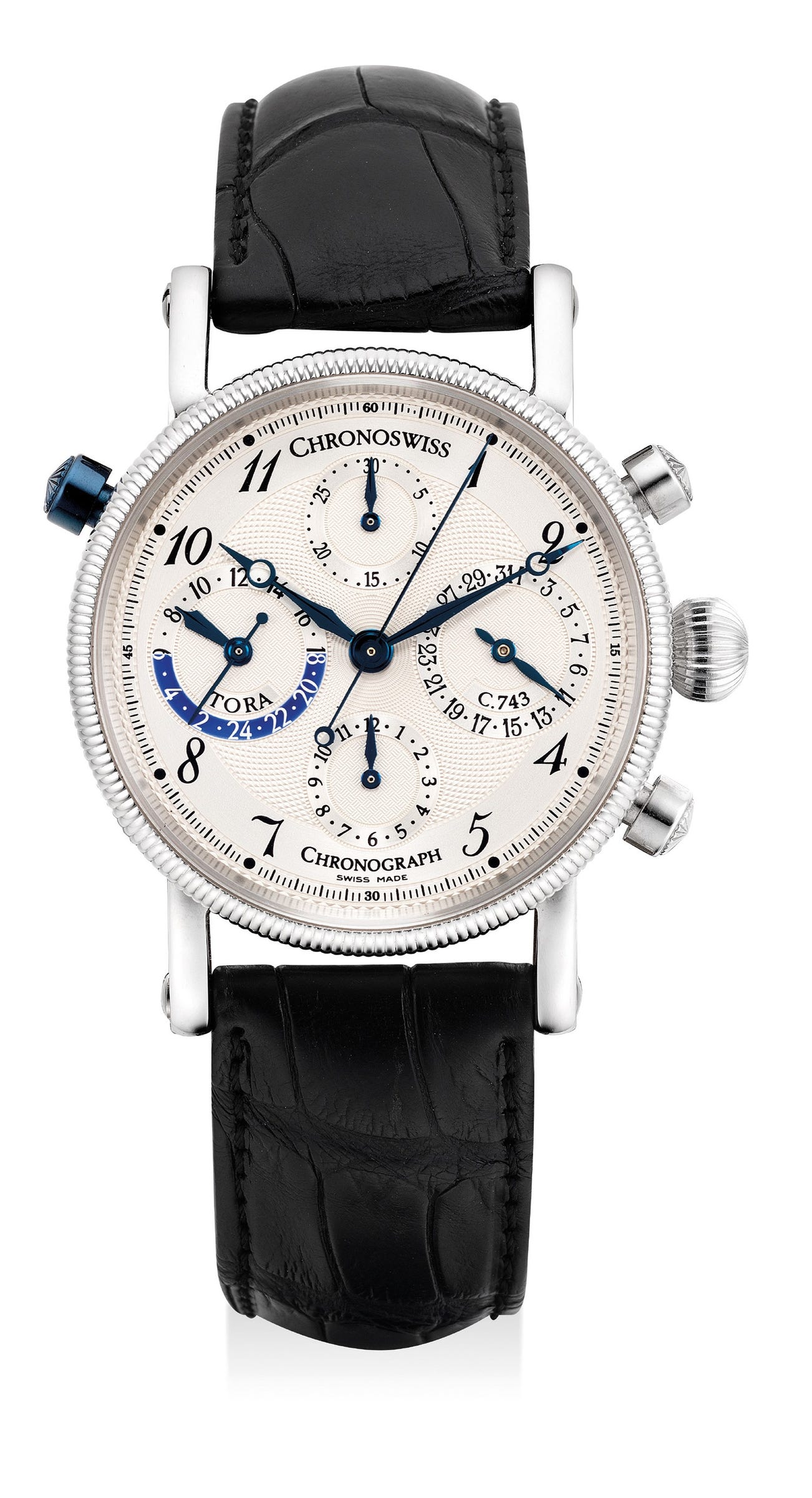 With the first ever world time watch launched in 1994 by Chronoswiss and named “Tora”, the manufacturer introduced the “Tora Chronograph” in 1999. The watch featured a dual time zone function with a chronograph movement. Encased in platinum, the second time zone is indicated on the left subsidiary dial and set by the blue pusher located on the 10 O’clock position.