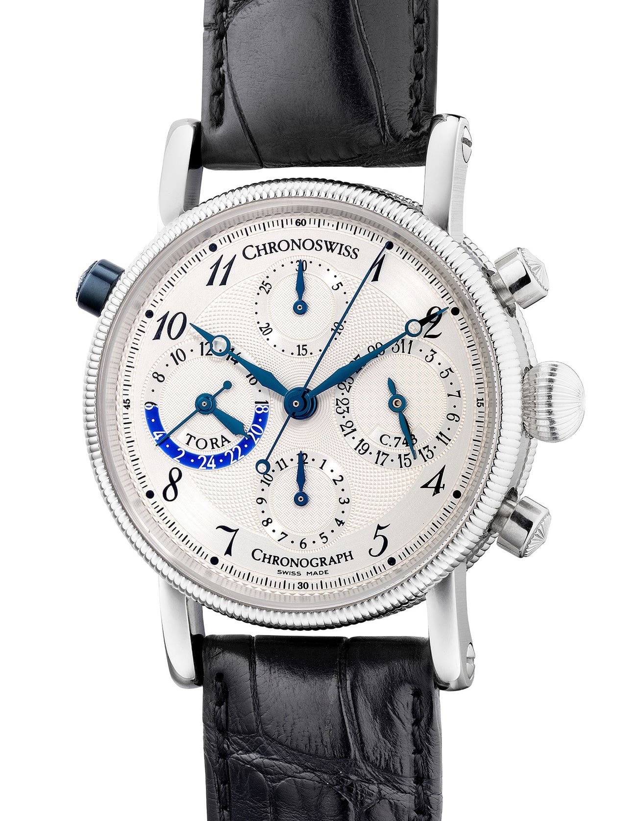 With the first ever world time watch launched in 1994 by Chronoswiss and named “Tora”, the manufacturer introduced the “Tora Chronograph” in 1999. The watch featured a dual time zone function with a chronograph movement. Encased in platinum, the second time zone is indicated on the left subsidiary dial and set by the blue pusher located on the 10 O’clock position.
