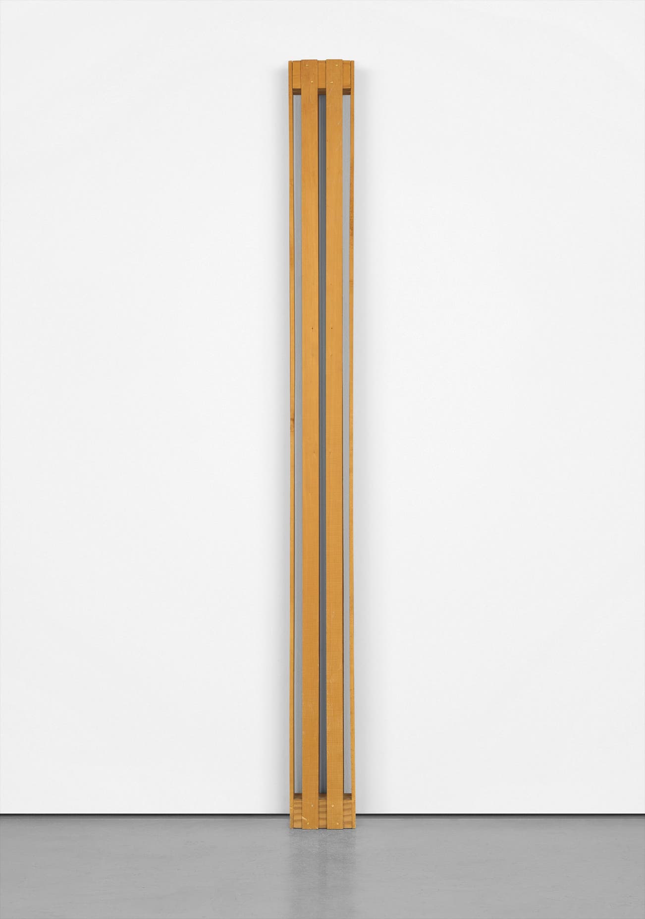 The present work, one of a set of elongated crates, belongs to a larger series of the same name that encompasses “pallets” and “cases” made from identical materials. The crates differ very slightly in dimension as well as in the number of wooden slats and the spaces between them; as a series, they explore mathematical and perceptual questions of density, the different means and possibilities of shaping space. Particularly in their vertical orientation and even more so when installed directly on the floor, the crates engage the physical space that they inhabit, not least that of their viewers. Neither purely self-referential nor simply a prop for phenomenological experience, as indicated in North American Minimalism, Ouro e paus acknowledges the social and symbolic history of its materials, whose “paradoxical relationship” remarks further upon the invisible systems and structures of the economy. “I try to establish a repertoire of objects which are simultaneously substance and symbol—a familiar repertoire,” Meireles allows. “There is a moment in which the objects are articulated, revealing their privacy. In other words, there is an internal, constitutive order, which is invisible.” An abstraction of capital and the contingencies of value in the contemporary world, Ouro e paus meditates on global economies of scale and of power, elegantly distilled in its simple wooden boards and trenchant nails of gold.