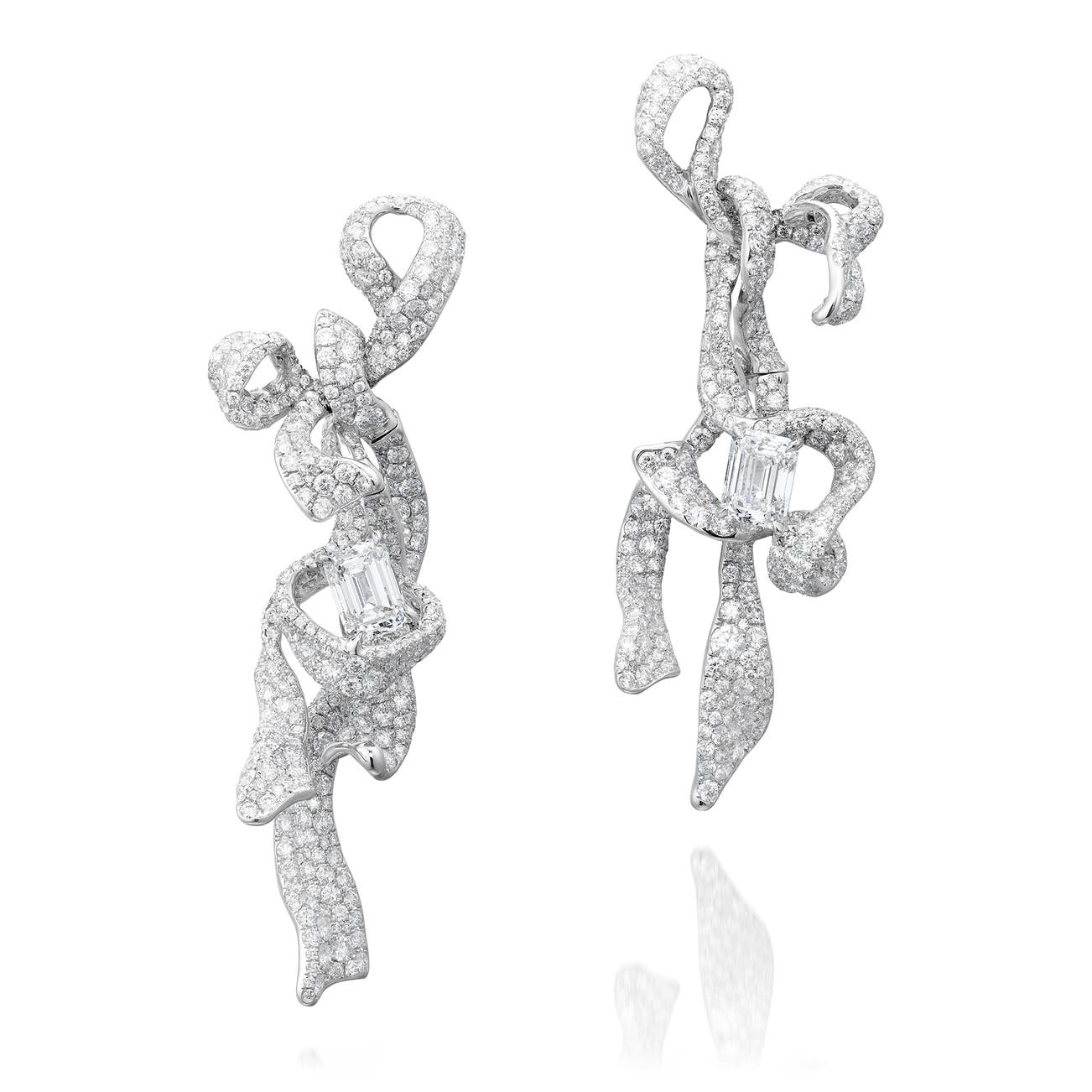 Of entwined ribbon bow design, each set with an emerald-cut diamond weighing 2.01 carats, pavé-set with brilliant-cut diamonds, mounted in white gold, signed Cindy Chao, numbered, post and hinged back fittings, length approximately 69 mm.