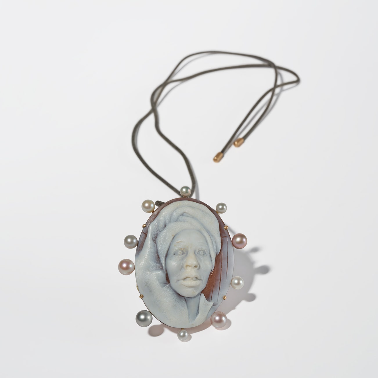 Oval-shaped carved sardonyx shell cameo with cultured pearls, 18 karat rose gold and dark gray cord.
