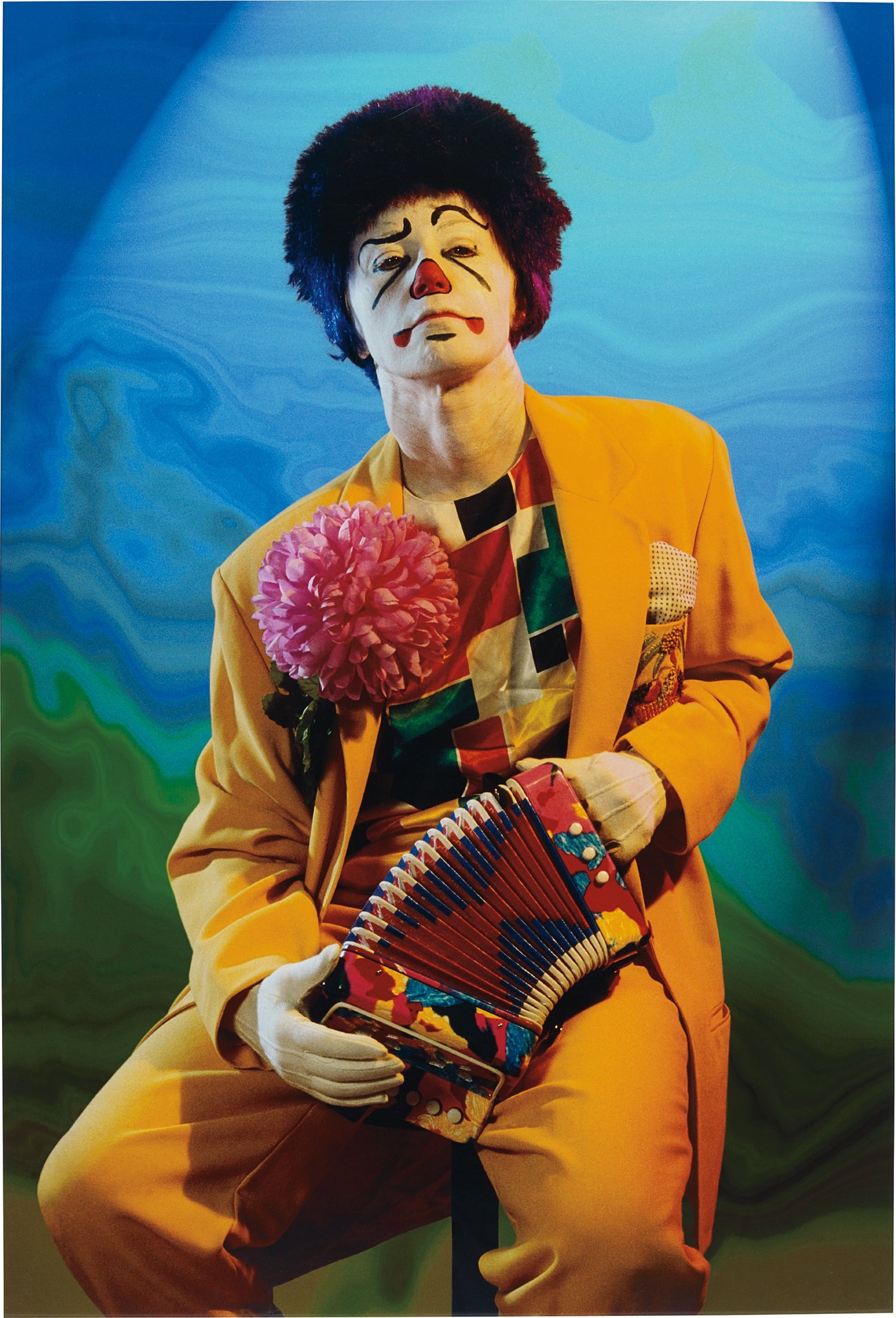 If their artifice and dark comedy make a metafictional drama of her own creative project, the clowns also deepen Sherman’s inquiry into the nuances of stereotype. As though aware of his own status in collective imagination as a typecast figure of tragedy, the clown in the present lot looks grimly sardonic in his chosen part, a quizzical eyebrow competing in cartoonishness with the vast flower at his lapel. He is an eerie presence, uncanny stagelight recalling the suburban gothic of David Lynch’s red-curtained cinematic underworlds. The digitally manipulated background was an innovation, isolating the clown against psychedelic stage scenery. Sherman has spoken of the challenge of imbuing each figure with individual personality. ‘The clowns were hard because it was really difficult to feel that I was finding a character beneath the makeup that would be different in each one, so it wouldn’t seem like they were all just me with clown makeup on. That took some work.’ (Cindy Sherman in Kenneth Baker, ‘Cindy Sherman: Interview with a Chameleon,’ Walker Art Magazine, 1 November 2012).