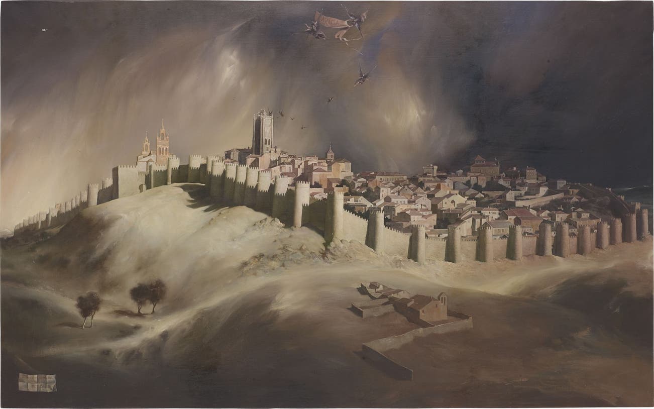 In 2001, Bravo told Americas magazine, “The photorealists, like machines, copied directly from photographs….Always I have relied on the actual subject matter because the eye sees so much more than the camera: half tones, shadows, minute changes in the color or light.” His innate ability to see beyond the real – a genre denoted by scholars as “hyperrealism”—is yet another example of Bravo’s ability to bridge, stylistically and theoretically, the disparate yet interwoven schools of the Baroque, surreal and contemporary. Alluding to his surrealist predecessors and anticipating the color-field theory of the mid-century, the artist’s application of a subdued and sensitive palette only heightens the atmospheric quality of Vista de Ávila. Strongly influenced by the work of Salvador Dalí, Bravo envelops Ávila in a shroud of nuanced shadows, framing the medieval walled city in a magical, almost divine, cloud of light. Undoubtedly inspired by the surrealist master’s many views of the Cadaqués region of Spain, Bravo’s painterly, neutrally-toned landscape transcends the realist cityscape, interpreting the rolling hills of the Spanish countryside as luminous waves. As though presenting the story of a lost yet timeless world, Bravo’s application of the surreal further extends to his presentation of the haunting trail of birds emerging from the town’s chapel, symbols of another mystical dimension extending into present. Carefully nuanced in execution and vision, Vista de Ávila unites past and present in an exquisite homage to artistic representation of the sublime, as interpreted by masters old and new.