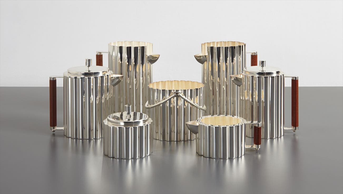 Produced by Cleto Munari, Italy. Comprising two pitchers, coffee pot, teapot, covered sugar bowl, creamer and ice bucket. Underside of each impressed with designer's signature and firm's mark, MADE IN ITALY, Italian assay marks and standard 925 mark. Together with original boxes.