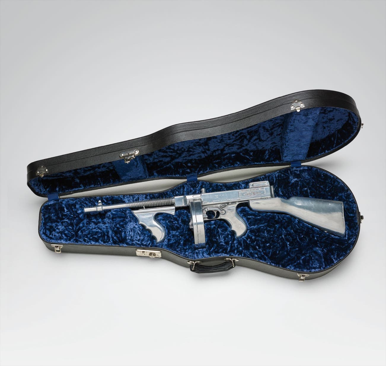 Aluminium replica Tommy gun, contained in a blue velvet-lined instrument case.