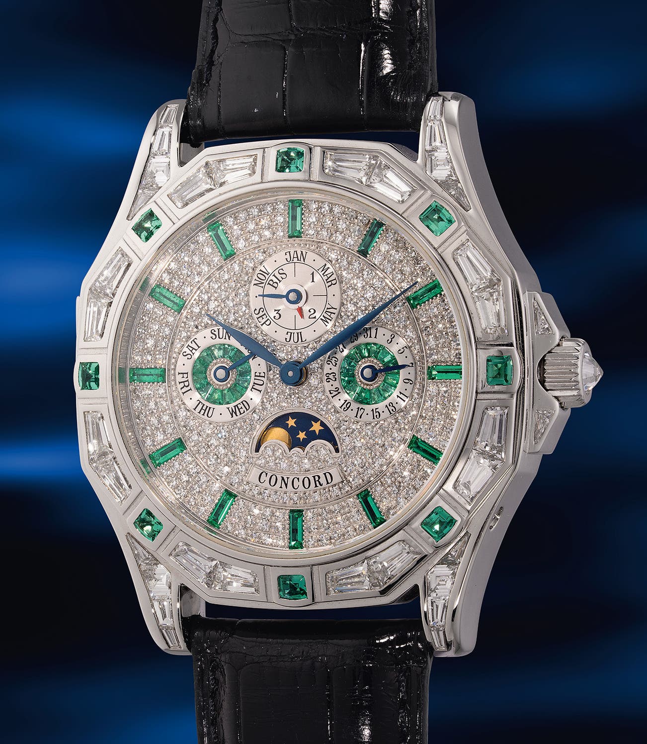 The Concord Saratoga Splendour Esmeraude is an extraordinary fusion of haute horlogerie and haute joaillerie. The case is meticulously carved from a solid block of platinum and adorned with 8 trapeze emeralds (0.65 ct) and 38 trapeze diamonds (5.02 ct) on the bezel, extending through the lugs. The dial features a stunning pavé setting of 279 diamonds totaling 1.1 ct, with an additional 36 baguette-cut emeralds (1.3 ct) serving as hour markers and for the day and date registers. The platinum buckle is also embellished with six tapered-cut emeralds.