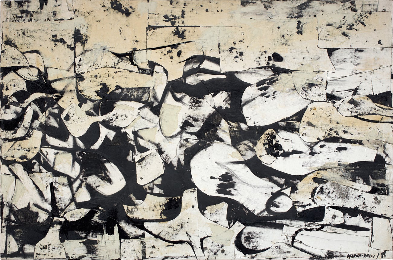 signed and dated “MARCA-RELLI / 57” lower right; further signed with the artist's initials "M-R" on the reverse; further signed, titled, and dated “MARCA-RELLI M-2-57 THE EXPENDIBLE” on the stretcher
