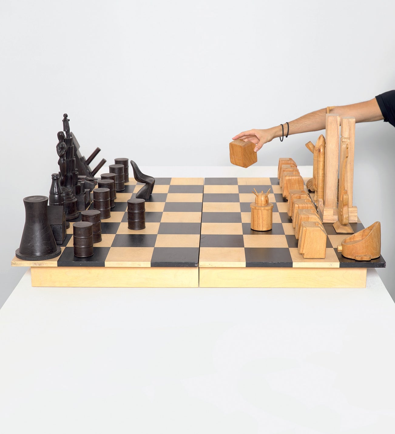 “The history of the last century has often been compared to a chess game, with political systems, brands, and artistic movements jousting for world dominance. Each figure in our monumental chess set alludes to a particular icon of the century’s troubled history, from the sinking Titanic to the scarred towers of the World Trade Centre. The Space Shuttle, Coca-Cola Bottle, Unabomber Cabin and VW Beetle-are all here. Essentially our chess set is a collection of 32 different sculptures. Their display changes instantly, according to the progress of the game”. Constantin and Laurene Boym