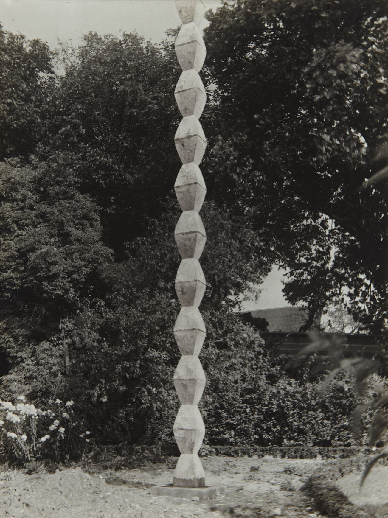 The photograph Endless Column in Steichen’s Garden at Voulangis circa 1923 depicts one of Brancusi’s most iconic sculptures once he had it installed in the Voulangis garden of fellow photographer Edward Steichen. Incidentally, it was outside Rodin’s house in Paris a decade prior that Steichen met Brancusi for the first time. Enchanted by Brancusi’s sculptures, Steichen encouraged Alfred Stieglitz to give Brancusi his first American exhibition in 1914 at ‘291’, the hub for Modernism in America at the time. As evidenced by this image, the bond between Steichen and Brancusi lasted well beyond the exhibition. Indeed, Steichen became a lifelong supporter of Brancusi’s and purchased many of his sculptures. Endless Column in Steichen’s Garden at Voulangis is a testament of the friendship between the two visionaries. Moreover, while this particular rendition of the sculpture is no longer in existence, Brancusi captured its essence for posterity, cropping the column to accentuate its seemingly endless nature.