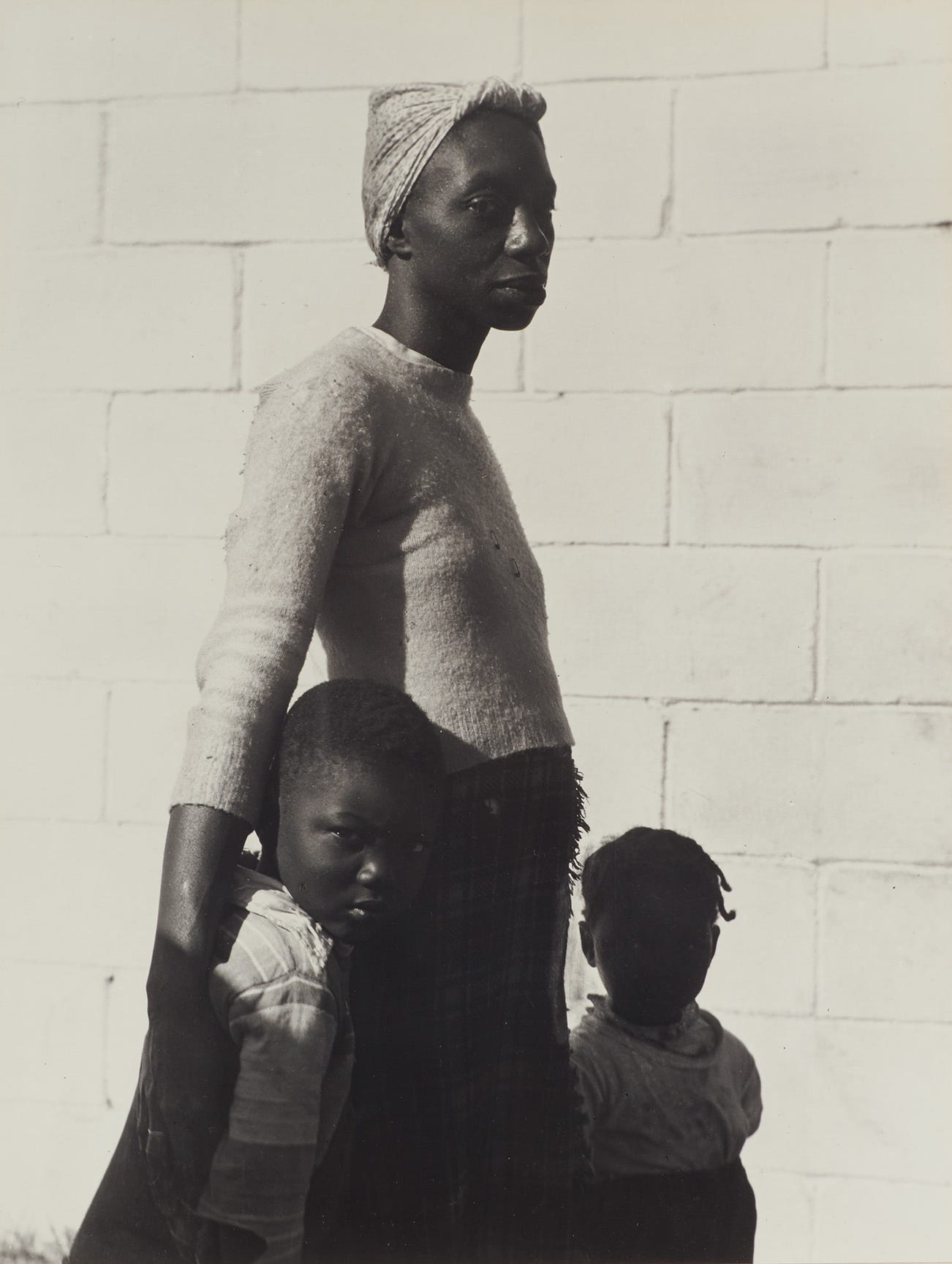 She is a Tree of Life to Them was made by Consuelo Kanaga in Maitland, Florida, where she had taken up brief residence in an artists’ colony in the winter of 1950. Venturing into the reclaimed agricultural swampland around Maitland, she documented the lives of African-American field workers. The image gained icon status, as well as its title, in Edward Steichen’s 1955 blockbuster exhibition The Family of Man. There it was paired with a phrase from Proverbs 3:18—‘She is a tree of life to them that lay hold upon her: and happy is everyone that retaineth her’—and has been known by that title ever since. For Steichen, the photograph represented an archetype of motherhood, and he often referred to it as one of his favorite images in the show. He wrote, ‘How completely this picture speaks . . . for itself! This woman has been drawing her children to her, protecting them, for thousands of years against hurt and discrimination’ (The New York Times Magazine, 29 April 1962, pp. 62-63).