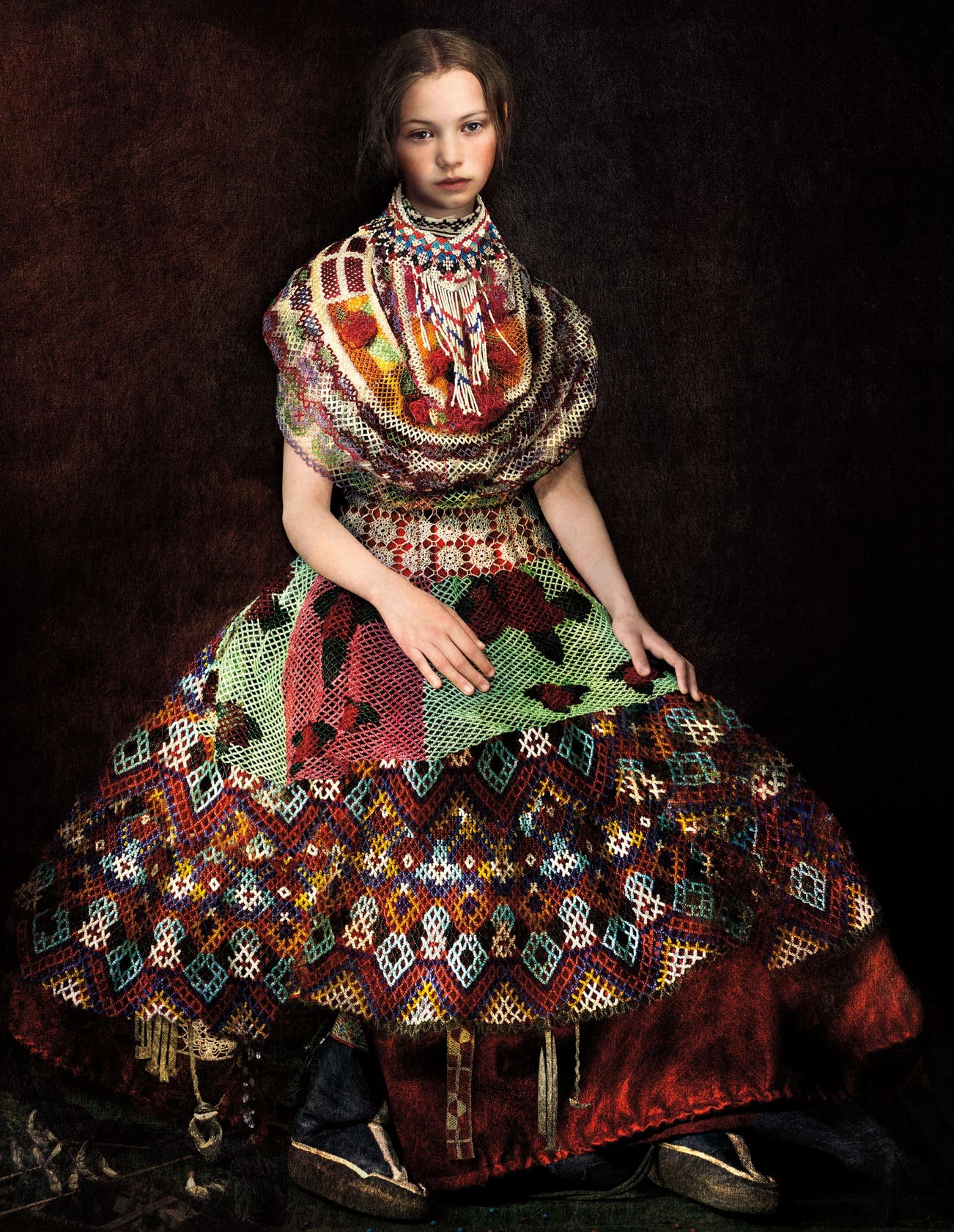 Between 2012 and 2014, the artist duo Sarah Cooper and Nina Gorfer worked on The Weather Diaries, a commissioned project on interpreting fashion from Iceland, Greenland and the Faroe Islands. Their exploration led them to the common theme of tradition versus modernity. In The Trinket Dress, the Greenlandic costume is sewn entirely of glass beads and is tremendously heavy. The isolated girl represents pride in national identity but at the same time is weighed down by the restrictions surrounding tradition. Cooper & Gorfer’s works have been shown widely in the US and Europe. The Weather Diaries is currently on view at The National Museum of Photography in Copenhagen.