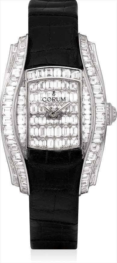 Lavishly fitted with baguette and brilliant-cut diamonds throughout, the present watch stuns with its opulence and brilliance. While baguette-cut diamonds adorn each side of the bezel, the band also features another curved line of baguettes. Even the dial is fitted with 36 individual baguette-cut diamonds, with the sapphire crystal signed 'Corum' as to not disrupt the diamond setting below. This watch truly bridges the gap between jewelry and horology.