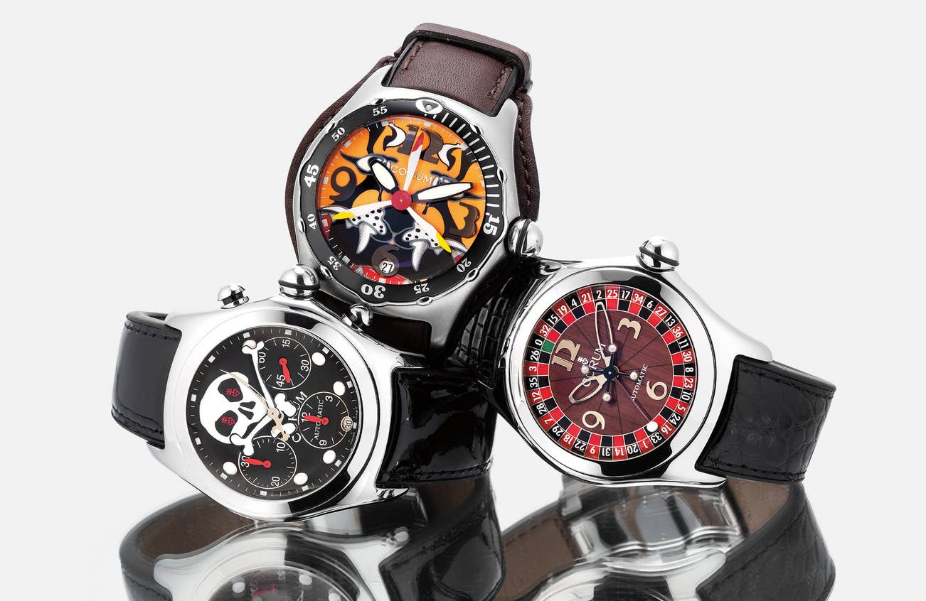 Corum introduced the “Bubble” collection in 2000 as an oversized wristwatch with extra-large crystal that was to be a radical change from traditional horology and appeal to a new millennium. The watches were produced in limited numbers and paid tribute to a variety of themes as seen with these three iconic timepieces. The “Jolly Roger” chronograph identifies with the traditional flag flown by pirate ships during the early 18th century, while the “Casino Bubble” with roulette dial is a remember of casinos around the world and the “Bubble Dive Bomber” is a tribute to the Flying Tigers, one of the most successful and celebrated combat groups in aviation history.