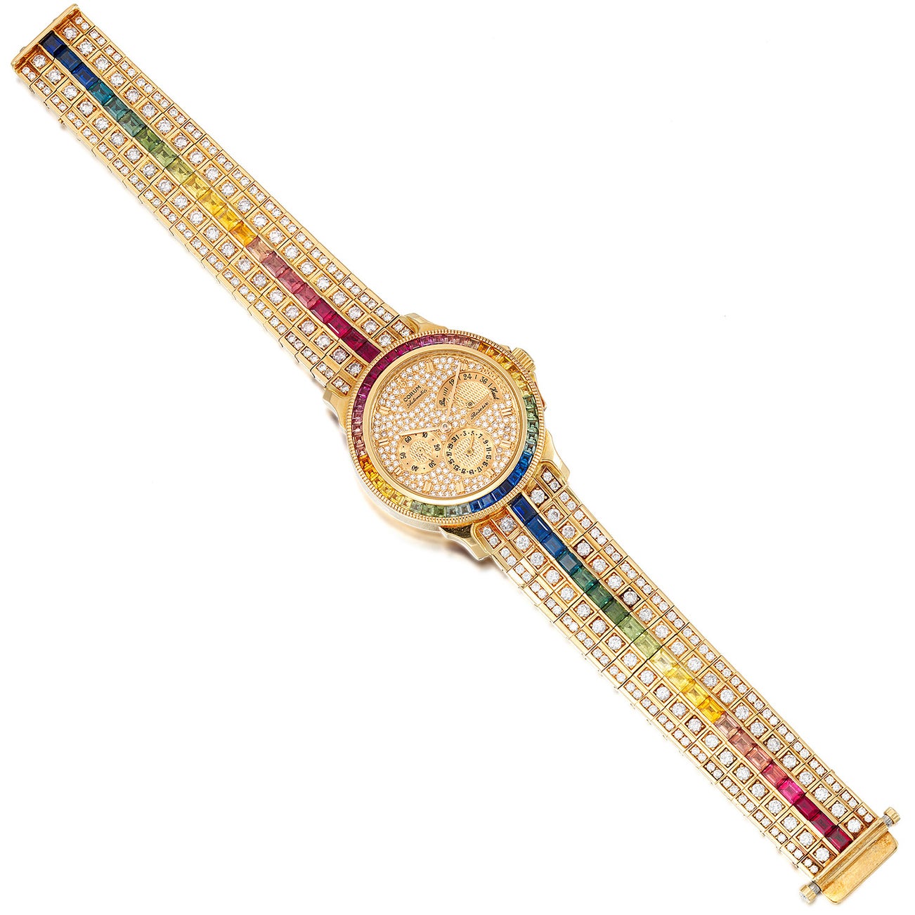 During the 1980s, Swiss manufacturers began to adorn sports watches with gemstones for their exclusive and demanding clientele, and over the past decade these rare timepieces have become collectors’ favorites due to their exquisite workmanship and quality. The present Corum wristwatch is a wonderful representation of this period, set with diamonds and a prism of multi-color sapphires. Confirmed by Corum, the present watch originally retailed for 184,600 CHF when it was manufactured in 1993.
