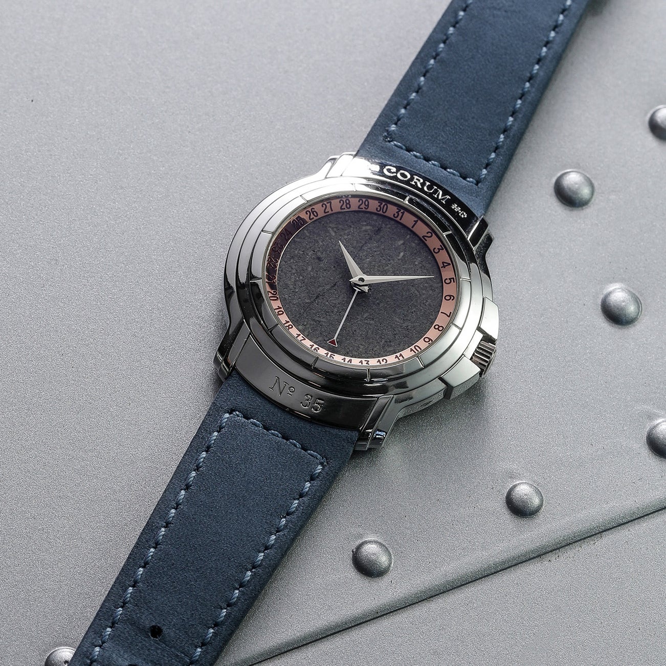 -The present watch, cased in platinum is manufactured by Corum and fitted with a meteorite dial that is derived from the planet Mars. Most interestingly, the meteorite material used is called "Zagami" and fell in October 3, 1962 with an impact point in Nigeria