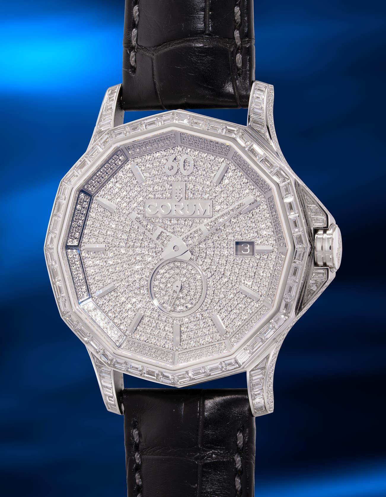 Accompanied by undated Corum warranty certificate, Corum gemstones certificate, instruction manual, product literature, black leather folio, fitted presentation box and outer packaging.
