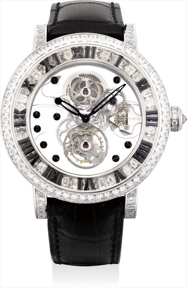 An impressive and attractive white gold and diamond-set skeletonized tourbillon wristwatch, numbered 4 of a limited edition of 10 pieces