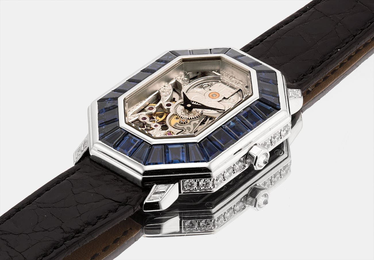 A striking example of bejeweled timepiece, the present lot impresses, beyond its overall look, especially by the remarkable size and quality of the gem-setting. Two baguette-cut diamonds adorn each lug, and 22 princess-cut diamonds are encrusted in the band. The crown and buckle as well are diamond-set, but the main aesthetic effect is entrusted to 28 massive baguette-cut sapphires set in the bezel.