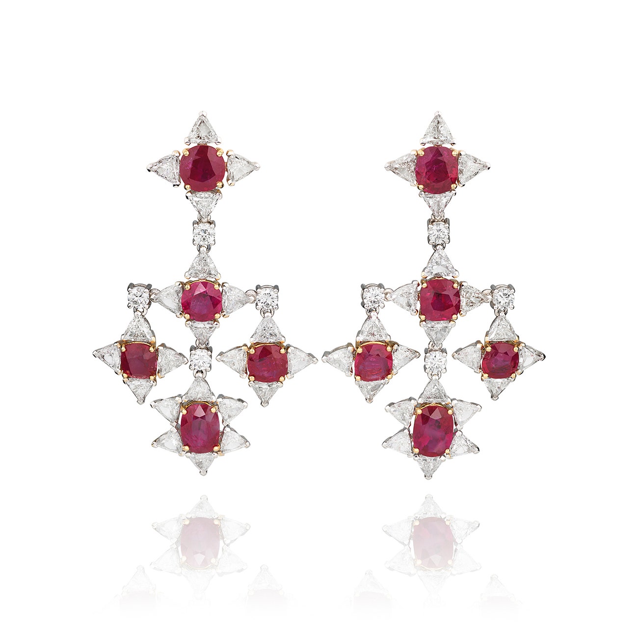 Each set with oval and cushion-shaped rubies weighing from 1.10 carats to 2.10 carats, accented with triangular and brilliant-cut diamonds, length approximately 60mm, each signed Costantino Repossi, Italian maker's marks and assay marks for gold, post and hinged-back fittings, case stamped Costantino Repossi.